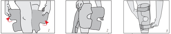 Step1: Open brace totally and place the brace horizontally at knee. The wide end at thigh and the narrowend at calf. (Picture 1).