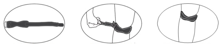 Step 2: Put the belt under the knee, wrap to the back, thread the belt through the plastic button.